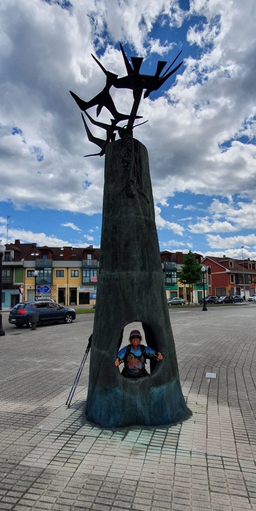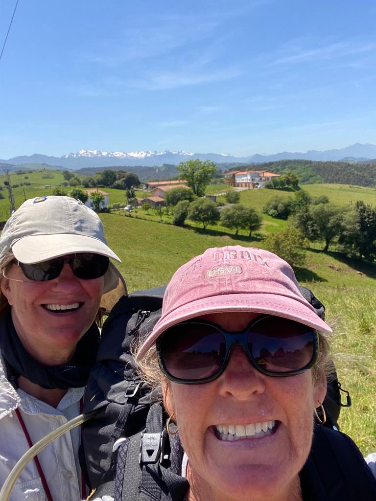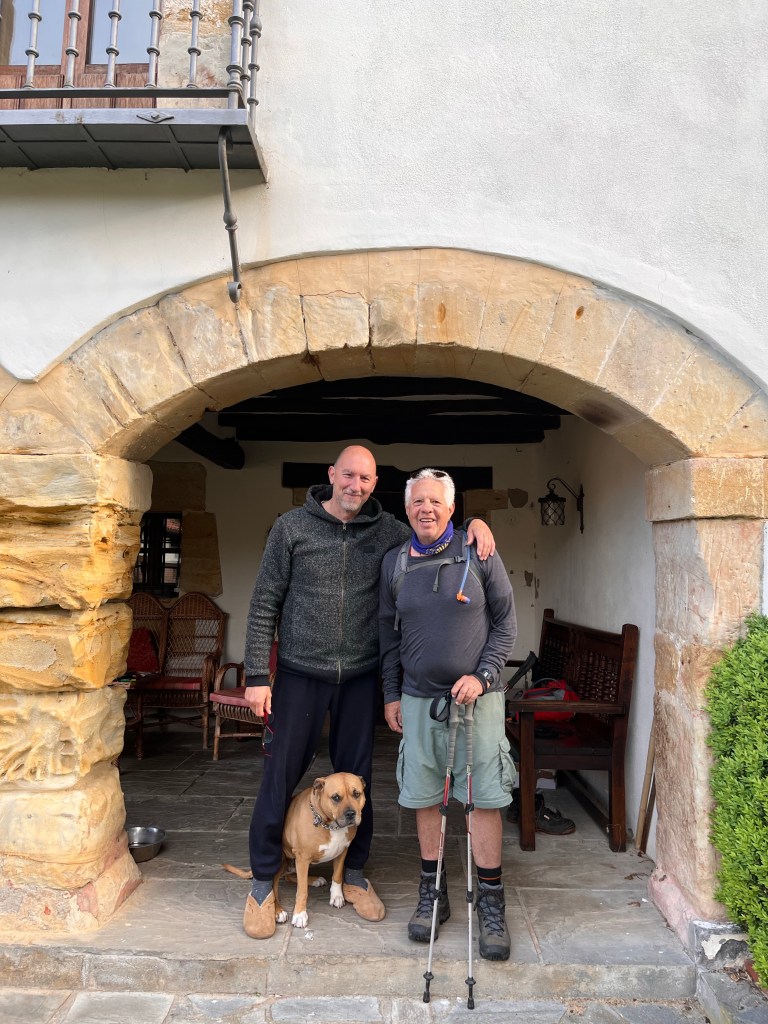 We left Abadin and started walking. Shortly before this photo, we paused. Lisa took photos and I put my jacket in my day backpack. Much later I realized that my glasses were missing! Vern and I had just walked down a dark tree lined path. When I told Vern my glasses were missing he immediately started climbing back up the hill to a spot that he remembered seeing me stop at. I followed him. I spoke to two Pilgrims and asked them if they saw my glasses to please put them on the Way Marker at the bottom of the hill.